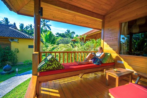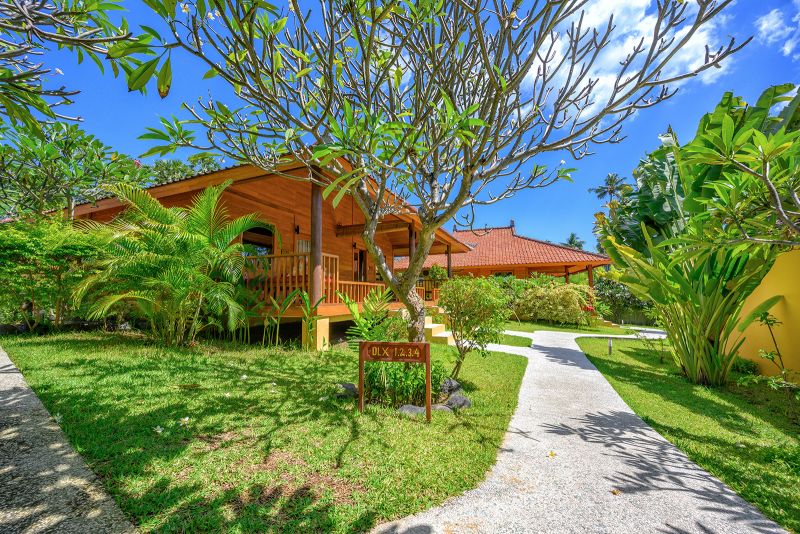 Das halboffene Badezimmer des Bungalows verfügt über ein Einzelwaschbecken und einen 1,5 m² großen Duschbereich. Von der 15 m² große Terrasse haben Sie Blick auf den schön gestalteten Garten. Auf der Terrasse finden Sie ein Sofa mit Tisch und einem Stuhl. Strand und Pool sind von der Terrasse aus leicht zu erreichen. In der DLX-Einheit ist Platz für 2 bis 3 Personen.